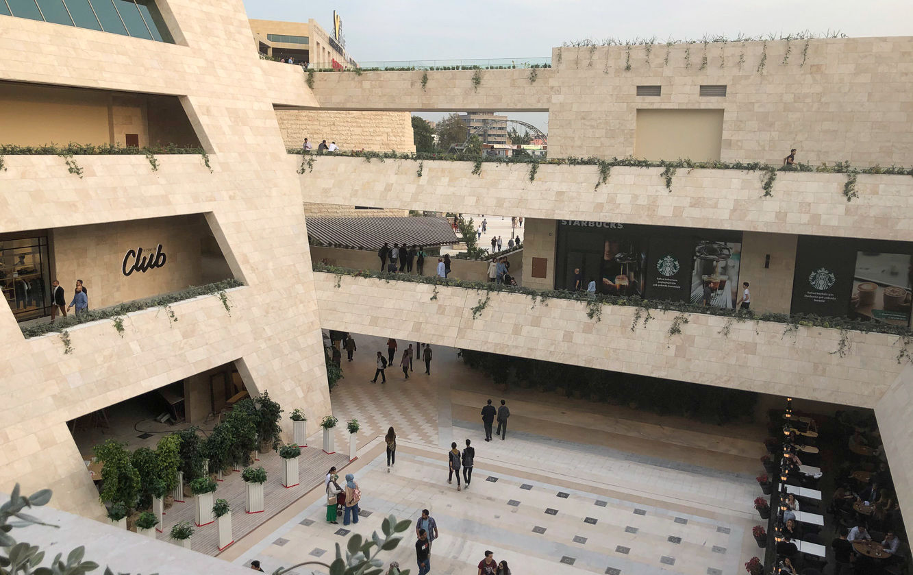 This haven incorporates the natural features of the surrounding architecture, building massing, local materials and colors with the notion of an oasis within an arid environment. The result is a wonderful landscape of contextual architype. Water becomes a major feature. An interactive lake in the foreground symbolizes the beginning of the entertainment experience and announces the project along the roadside. From there, trickling streams and cascading water features lead one into the sunken plaza - lined with restaurants, shopping, outdoor seating and social gatherings. The blending of this outdoor environment with the indoor shopping arcade, with its skylit, conditioned, and natural climate, creates a variety of choices for all to enjoy.